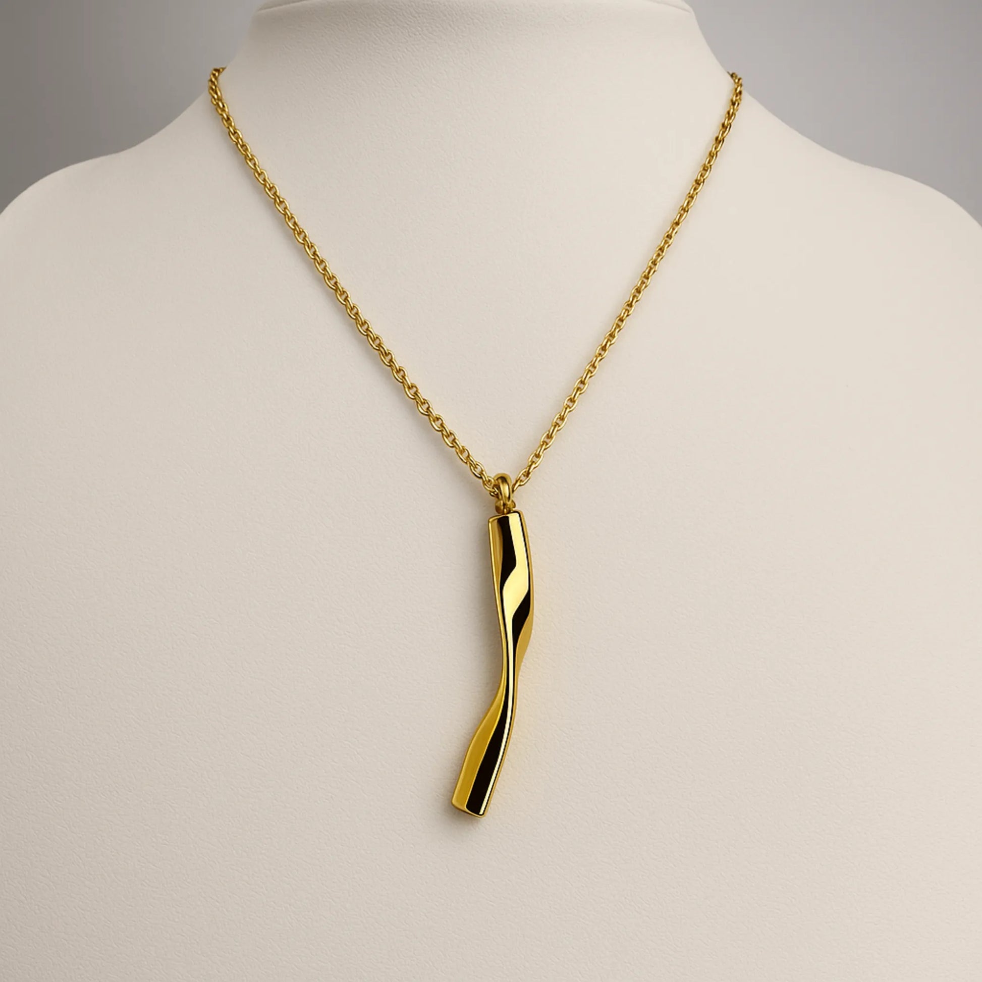 El Collar Abstracto Dorado es una pieza única que combina elegancia y modernidad en un diseño minimalista. Su dije alargado con forma retorcida aporta un estilo sofisticado y versátil, ideal para quienes buscan un accesorio llamativo pero fácil de combinar.